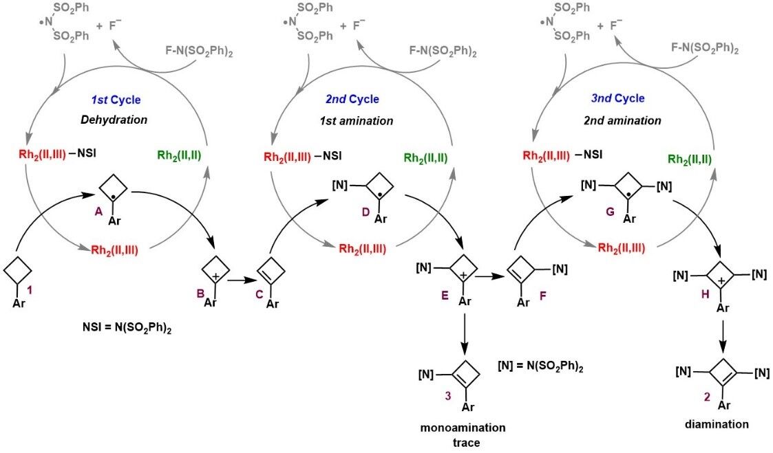 To achieve the diamidation of cyclobutane, Yuanhua Wang's group successfully achieved the diamidation of aryl cyclobutane at the C-2,4 position in 30 min with a maximum yield of 86% by using commercially available N-fluorobenzenesulfonimide (NFSI) as the oxidant and non-nitrene nitrogen source through a single-electron oxidation reaction catalyzed by dirhodium catalyst developed in recent years.