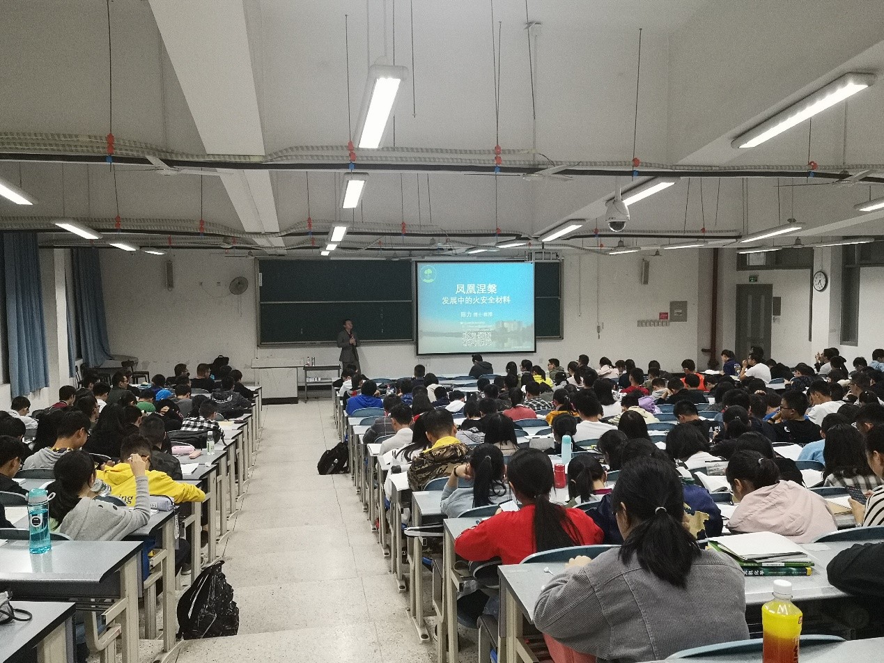 本次讲座的主题为“凤凰涅槃之发展中的火安全材料”,陈力老师主要讲解了化学在火安全材料方面的知识和应用。陈老师以火的起源为引,讲诉了火造成的巨大危害,为了消除火灾隐患,因此才有了火安全的研究。