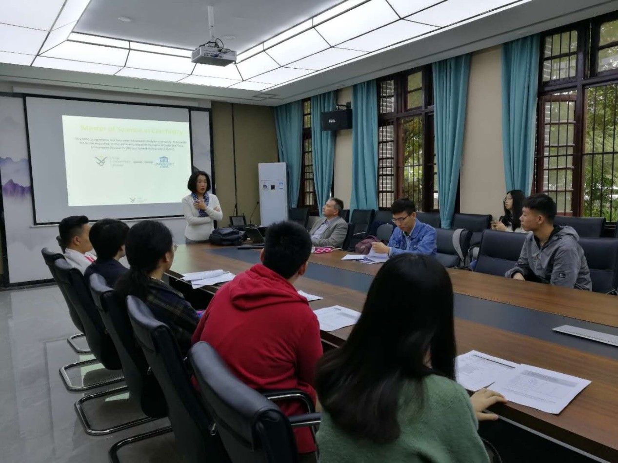 首先,Prof. Elskens为大家介绍了布鲁塞尔自由大学的化学学科的自由与民主,在这所大学中展现了无限的包容力和创造力。Elskens教授为大家着重介绍了布鲁塞尔自由大学化学系的研究重点,分别列举了在这些方面有所成就的教授以及他们的主要工作。在介绍研究重点之后,Prof. Elskens给大家展示了实验室硬件条件,这都为学生的课程与发展创造了丰富的条件。最后,Prof. Elskens给学生们讲授了课程安排、学分分配、毕业后的就业工作情况等一系列信息,让同学们对出国留学的情况以及未来的发展方向有了一个更加清晰的认识。在Prof. Elskens的报告后, Prof. Gao为同学们具体的介绍了英国上市公司365与VUB大学3+2项目化学专业的相关信息。两场报告风趣幽默,为在座的同学们提供了宝贵的信息。在自由提问环节,同学们向教授提出自己想要进一步了解的内容,教授们认真细致的做出了解答。教授还留下了每一位同学的信息,希望可以和同学们有更加深入的讨论交流。在同学们热烈的掌声中,此次报告落下了帷幕。结束后部分同学和教授进行更为深入的沟通。