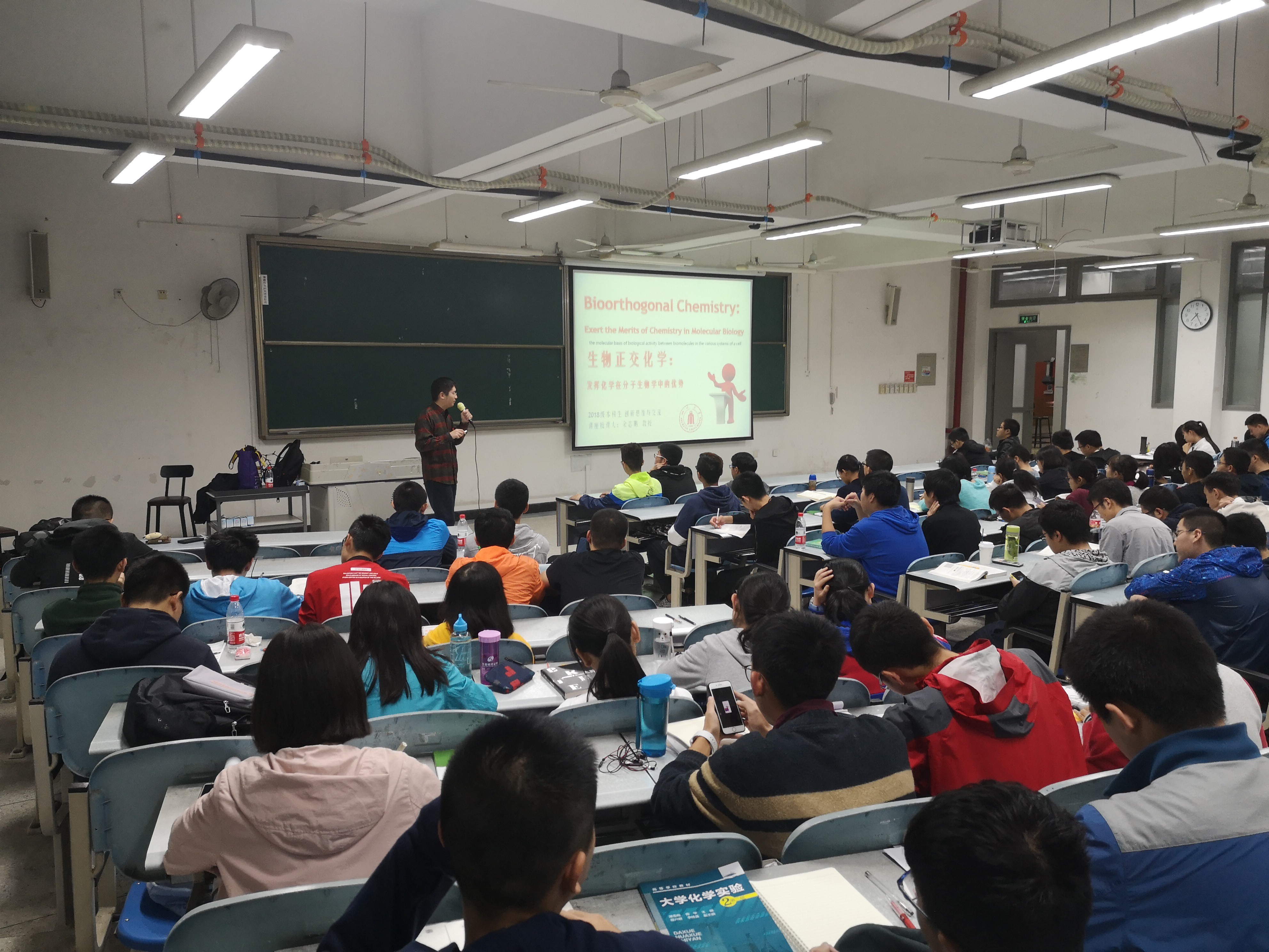 2018年10月23日晚,在江安校区综合教学楼C座107室,余志鹏教授为化学学院2018级新生带来了“创新思维与交流”系列讲座第五讲:生物正交化学,有力地说明了化学在分子生物学中的优势。