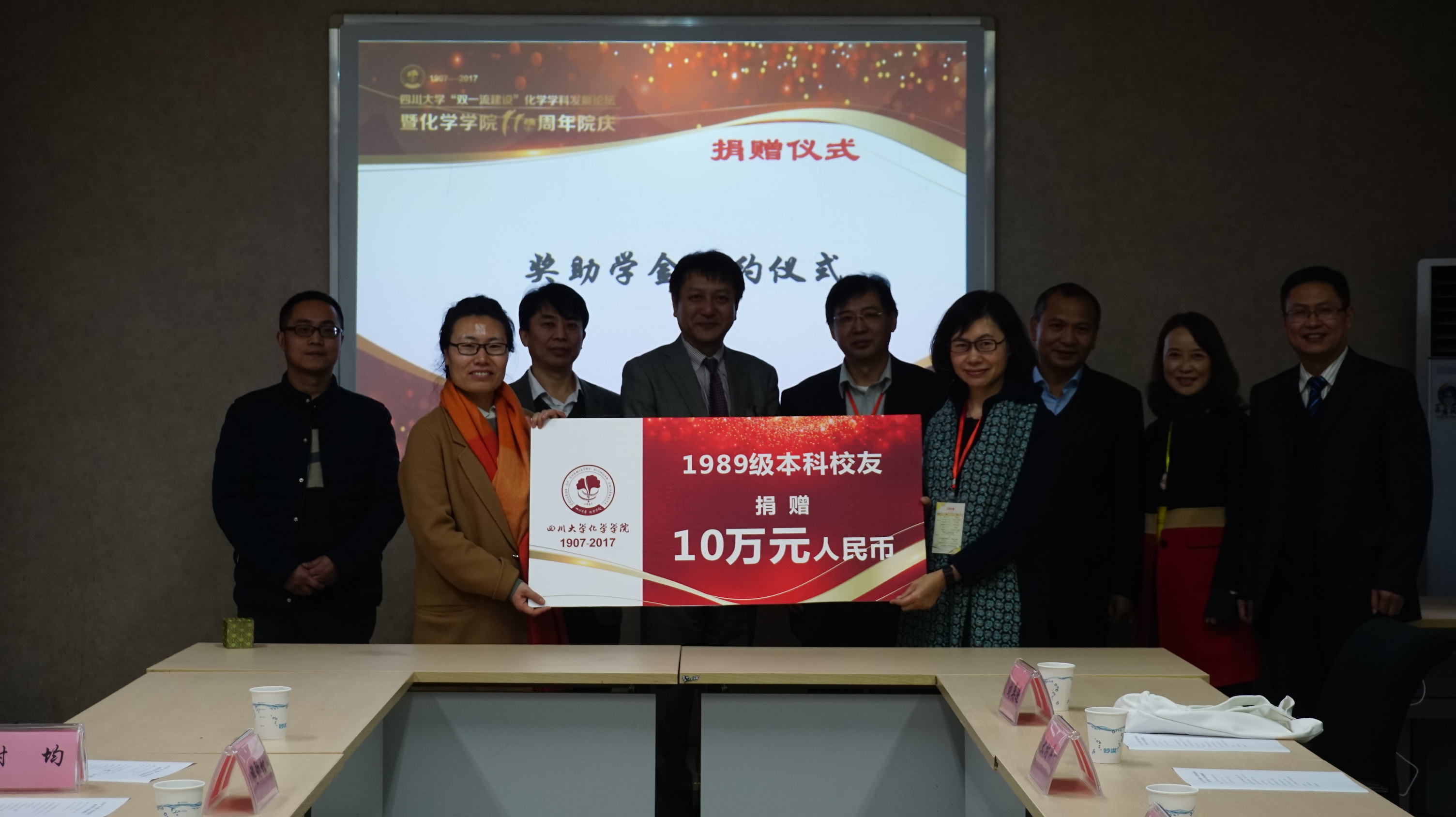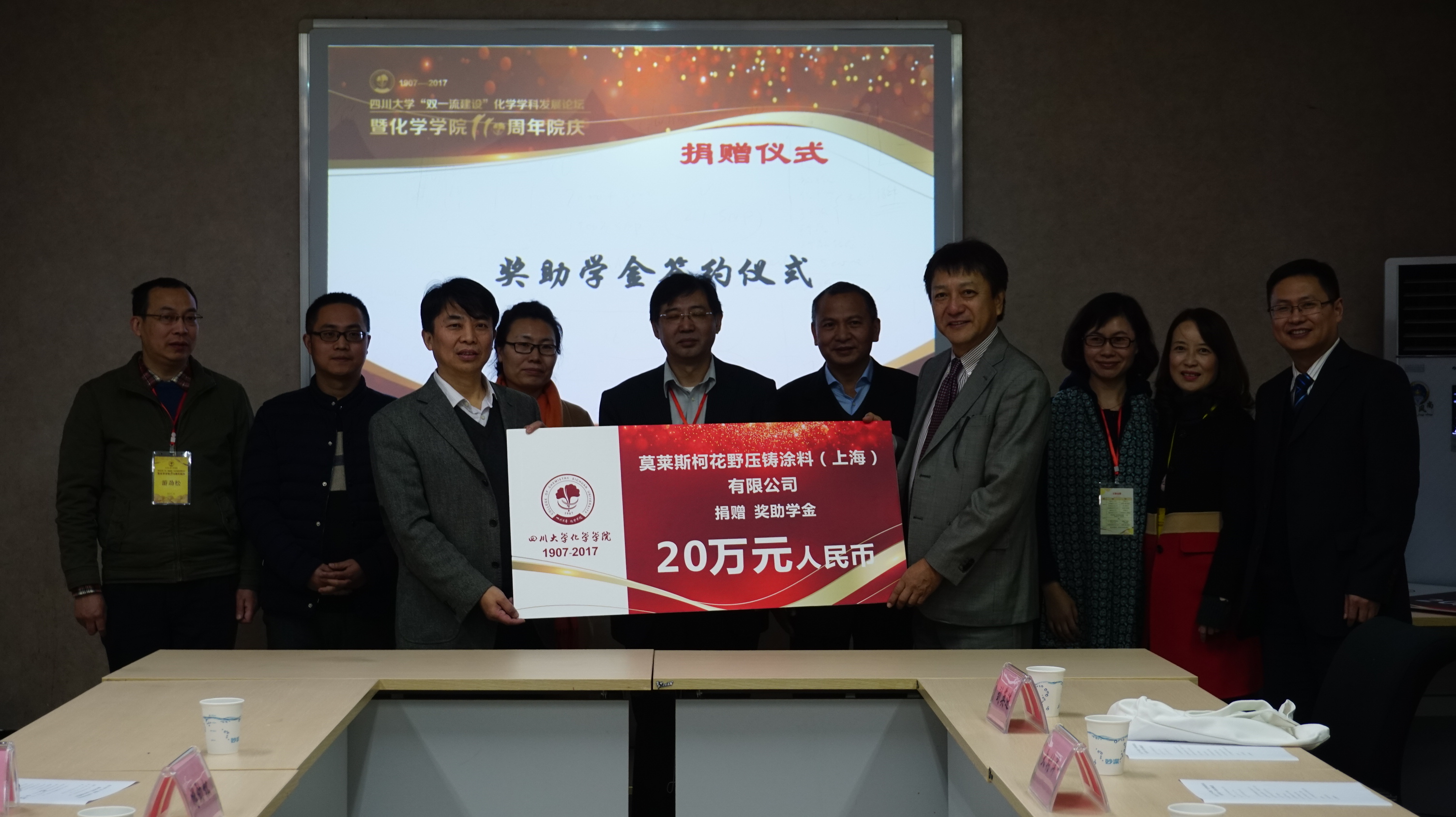 株式会社MORESCO管理本部长大村洋一先生,成都九品位酒业有限公司董事长李庆先生、总经理黄明江先生,1983级校友刘英进先生,1989级校友谢河灵女士,英国上市公司365教育基金会秘书长荣建国、外联办副主任贾秀娥,化学学院院长游劲松、党委书记王智猛、党委副书记谢均、校友科科长杜晓燕出席了本次捐赠仪式。捐赠仪式由党委副书记谢均主持。