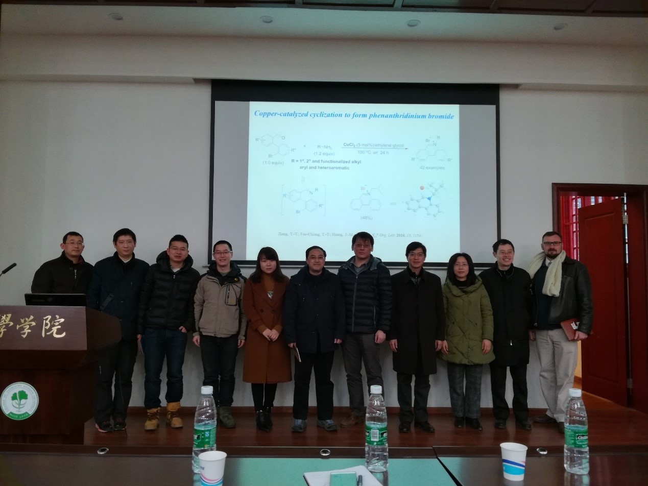 2018年1月17日上午10点,应化学学院邀请,淡江大学谢仁傑教授访问我院,并在化学馆321报告厅进行了以“Synthesis of Natural Alkaloids and Pharmaceutical Compounds through the Metal-Mediated Coupling and Addition Reactions of Nitrile and Imine”题的学术报告,主要介绍了其研究小组在金属催化的腈插入反应、钯催化的双重C-H官能化反应,以及该方法在(+)-horsfiline、amaryllidaceae alkaloids、indenoisoquiinolediones等具有良好生物活性的天然产物的合成中的应用。谢仁傑教授在报告过程中语言幽默风趣,讲解深入浅出,激起了在座老师和同学的浓厚兴趣。报告结束后谢仁傑教授与现场师生进行了深入交流,现场学术氛围浓郁。
