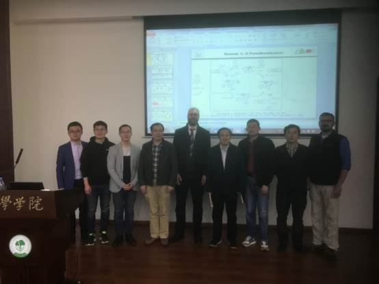 在报告中,Ackermann教授首先介绍了钌(II)催化体系中以双功能的磷酸盐和羧酸盐作为添加物促进的选择性的C-H烷基化和芳基化反应。随后介绍课题组利用第四周期廉价易得的镍,铁,钴和锰等催化剂在C-H活化方面的研究进展。此外,还介绍了多肽类结构的后期修饰和电化学在碳氢转化中运用。整场报告内容丰富,Ackermann教授讲解深入浅出,师生获益匪浅。在随后的自由提问环节,在座师生以该学科领域的前沿热点以及研究内容相关问题与Ackermann教授进行了热烈讨论。报告在热烈的掌声中落下帷幕,结束后部分老师与Ackermann教授合影留念。