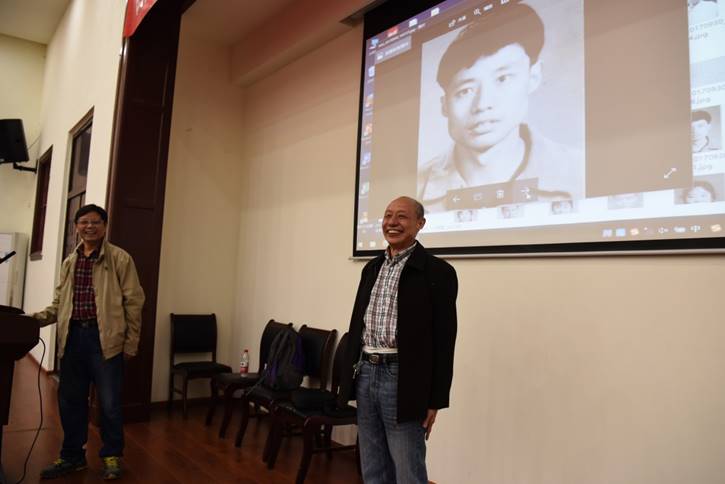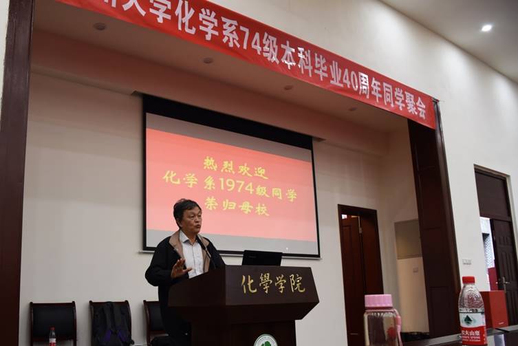 仍然在学院教书育人的李首建同学致了欢迎辞,并介绍了学院的发展近况。化学、有机、放化班班长代表年级的三个班同学发言回忆了当初的校园生活,同学情谊,表达了对学院良好发展趋势由衷的自豪和骄傲。许多同学都表示将鼓励孙辈考母校化学专业。留校同学到档案馆翻出了入学登记表上每个同学的青春照,一张张地慢慢放映在屏幕上让大家辨识…,40年前的面孔似乎变得有些陌生,又那么亲切…,同学们有叫不出名字的,有指认错了的,大家放肆地呼喊、尽情地握手相拥,321里充满了欢声笑语,令人感动、激动、开心。