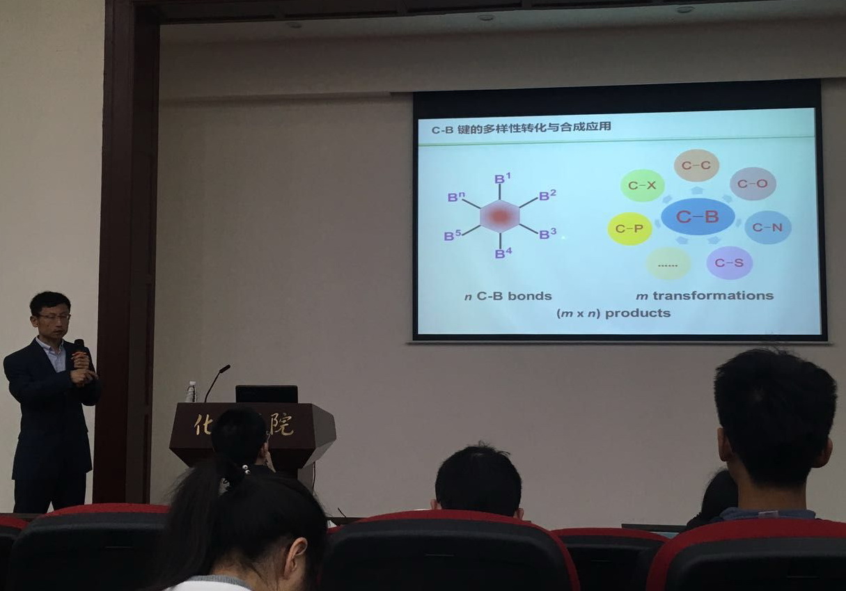 2017年4月26日上午,应英国上市公司365化学学院邀请,西安交通大学李鹏飞教授访问英国上市公司365并进行了学术交流。在化学馆321报告厅,李鹏飞教授详细介绍了该课题组的流动式光反应绿色合成芳基硼化合物研究工作,多硼试剂的制备及其选择性氧化偶联;随后,李教授报告了他们课题组在Tiglianes和daphnane类天然产物[5,7,6]并环的构建方面的最新进展。此次报告会由化学学院刘波教授主持,化学学院数位老师及相关专业的研究生聆听了报告。李鹏飞教授的报告内容新颖,讲解深入浅出,激起了在座老师和同学的浓厚兴趣,报告在热烈的掌声中落下帷幕。报告结束后,李鹏飞教授和现场的老师、同学们进行了多方面的交流与讨论。