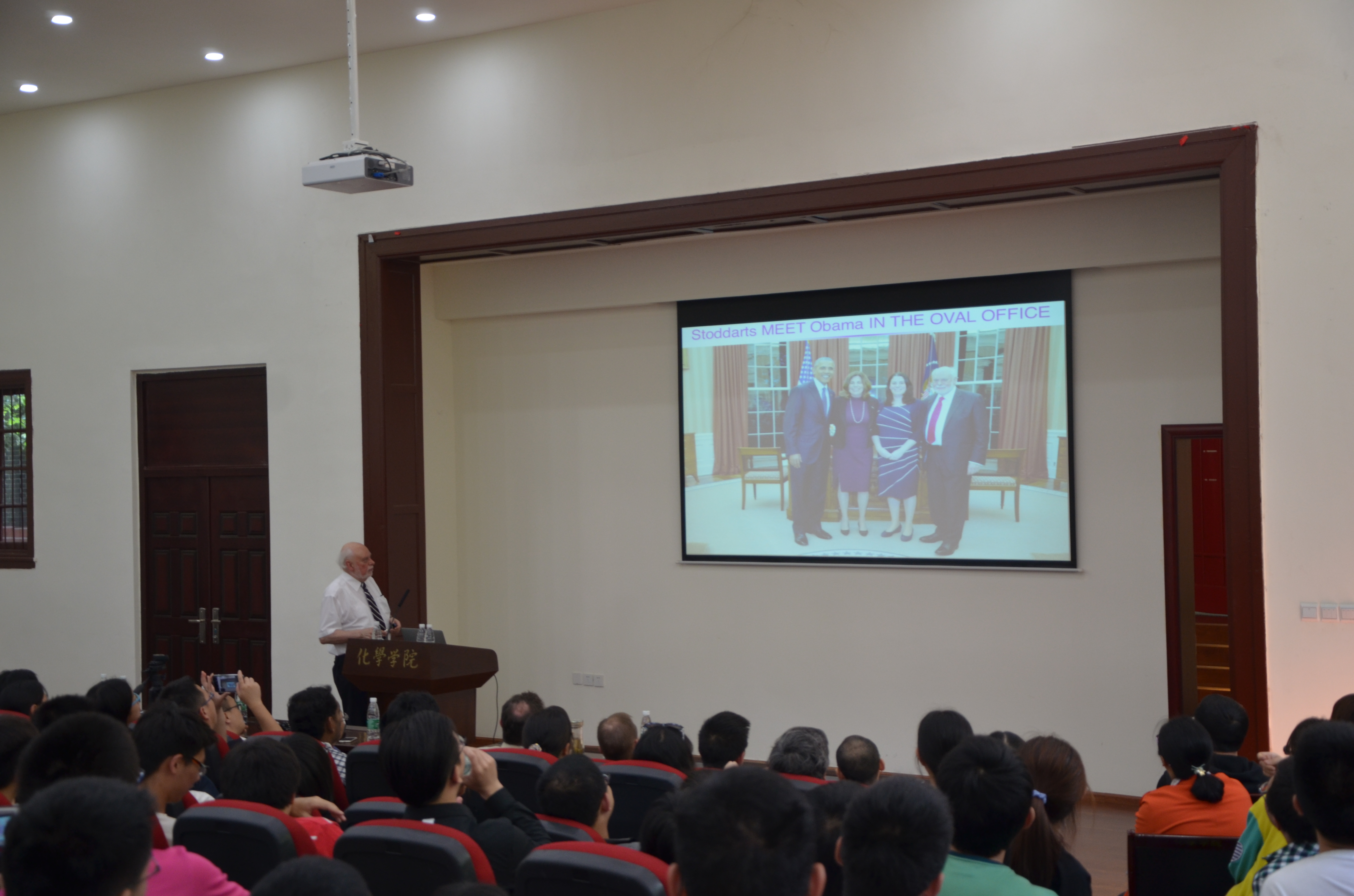 座谈结束后,Stoddart教授在化学馆321学术报告厅为全院师生做报告,报告由化学学院院长余孝其教授主持。共300余人参加了此次报告会,321学术报告厅座无虚席,很多来自其他学院的师生也早早赶来希望一睹诺奖得主的风采,整场报告在321学术报告厅门外的大屏幕上进行了现场直播。Stoddart教授用风趣轻松的语言为师生们介绍了自己的科研成果及人生经历,向大家展现出这位在全世界范围内颇具影响力的科学家不一样的一面。首先,Stoddart教授介绍了非共价互锁超分子结构的相关知识,并深入介绍了超分子化学、机械互锁结构、轮烷、索烃和分子节的发展历史,通过PPT展示了非共价互锁超分子结构的设计与合成及这些有趣的结构在分子开关和分子机器等领域的应用。在报告中,Stoddart教授重点强调了这些分子机器的最新研究动态、进展及未来的发展前景。接着,Stoddart教授与观众分享了自己的人生经历,将自己生活中的点滴及人生道路上的关键场景融入报告,并与师生探讨自己对于音乐及美术的理解。报告快结束时,Stoddart教授还谈到了创造力的来源问题,并鼓励在座师生始终坚持自己的科研兴趣,不要跟随大流。整场报告气氛轻松幽默,时不时迸发出欢声笑语和热烈的掌声。