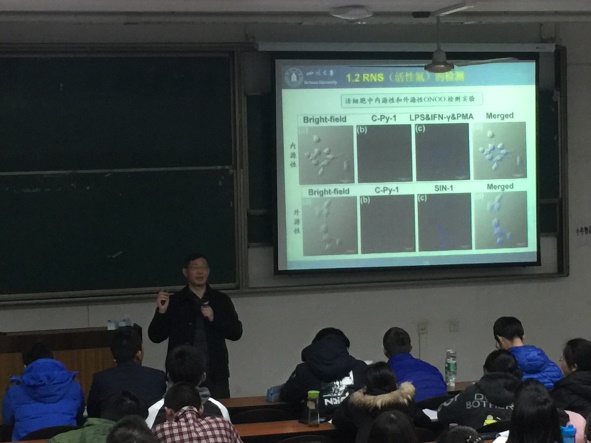 首先,余孝其教授为我们简单介绍了细胞内活性小分子识别的化学生物学,主要是针对活性氧等的荧光识别实验。接着,讲述了基因剪切的化学生物学,由于生物的限制酶进行剪切时不具有选择性,因此利用化学方式使其高效且具有选择性。然后为我们讲解了基因传递的化学生物学,主要是目前的基因治疗还存在着诸多问题,留待未来的我们解决。最后余孝其教授为我们介绍了自己的实验室与课题组情况,针对化学生物学与生物化学的区别进行了细致讲解,为我们解惑。