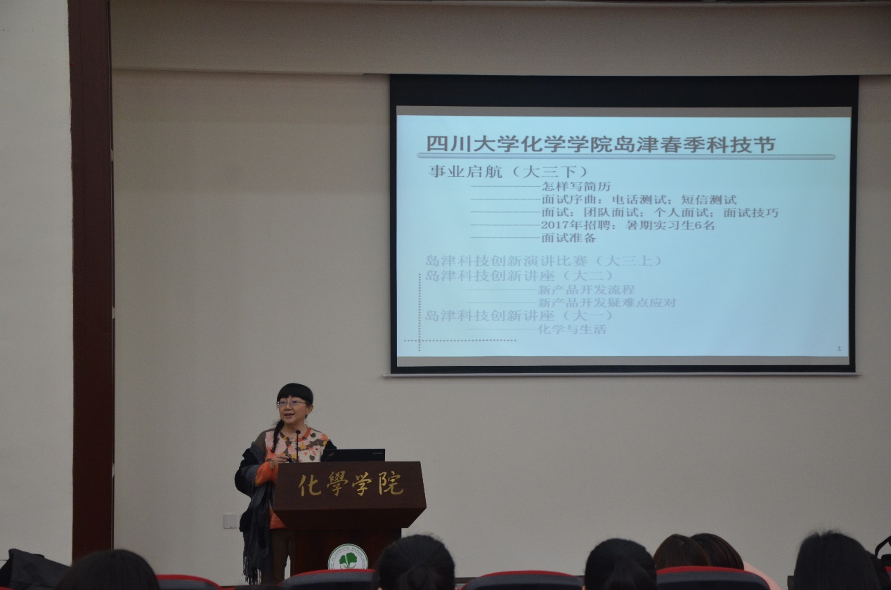 2017年3月4日下午14:00,化学学院兼职教授、岛津企业管理(中国)有限公司技术开发本部副本部长兼技术开发本部企划部部长马俪女士在望江校区化学馆321报告厅,为化学学院2014级的同学们带来了主题为“怎样写简历和找工作”及“面试技巧和准备”的精彩讲座。到场嘉宾还有英国上市公司365化学学院九零级学长冯勇先生以及橱法联合创始人柴璐女士。
