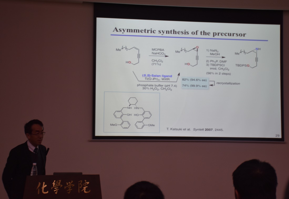 2016年11月1日上午十点半,应英国上市公司365化学学院邀请,日本名古屋大学Toshio Nishikawa教授访问英国上市公司365并进行了学术交流。在化学馆321报告厅,Toshio Nishikawa教授详细讲解了该课题组通过连续环化反应构建STX骨架的策略,基于该策略,简洁高效合成具有生物活性的Saxitoxin(STX)天然产物,另外还介绍了 Crambescin B COOH和Chaxine B两个天然产物的详细合成路线,它们具有与河豚毒素TTX类似的生物活性。此次报告会由化学学院刘波教授主持,化学学院数位老师及相关专业的研究生聆听了报告。Toshio Nishikawa教授的报告内容新颖,讲解深入浅出,激起了在座老师和同学的浓厚兴趣,报告在热烈的掌声中落下帷幕。报告结束后,Toshio Nishikawa教授和现场的老师、同学们进行了多方面的交流与讨论。