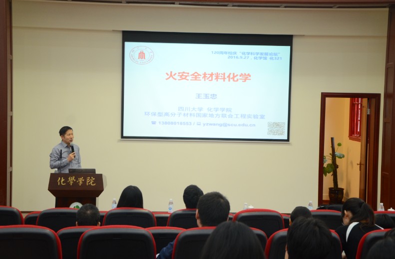 论坛上,冯小明院士作了题为“化学改变生活”的报告、王玉忠院士作为题为“火安全材料化学”的报告。两位院士的报告内容新颖,讲解深入浅出,激起了在座校友和同学的浓厚兴趣。论坛旨关注化学学科的知识普及和前沿发展,为学校师生分享大师们对化学研究领域重要进展和重大需求的深刻思想和精辟见解,从而更主动积极学习和参与化学方面的研究工作。