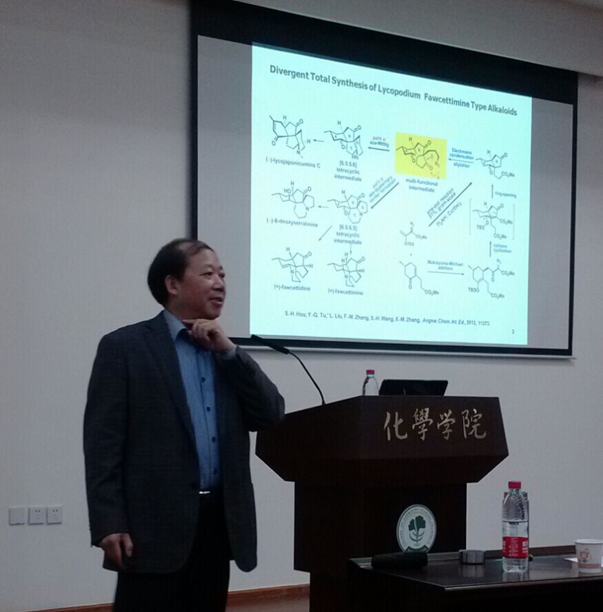 2016年4月12日上午10点,应英国上市公司365化学学院邀请,兰州大学化学化工学院涂永强院士访问英国上市公司365并进行了学术交流。在化学馆321报告厅,涂院士详细讲授了他所领导的课题组的特色研究:将构建手性季碳中心的Semipinacol Rearrangement和Schmidt Rearrangement与复杂天然产物全合成紧密结合。在底物的手性诱导或者手性催化剂作用下,该系列重排反应能够高效、高立体选择性地构建季碳手性中心,特别是螺环手性季碳中心。基于该方法学,涂院士课题组简捷高效地实现了一系列具有多个稠环和多个季碳中心的复杂天然产物的全合成,其中的代表性分子包括(+)-Alopecuridine、(+)-Sieboldine A、(−)-Lycojapodine A 、(-)-Lycojaponicumin C、(-)-8-Deoxyserratinine、(+)Fawcettimine、(+)Fawcettidine、Conidiogenone、Conidiogenol和Conidiogenone B等。此次学术报告会由化学学院冯小明院士主持,化学学院和华西药学院十余位教授及相关专业的研究生聆听了报告。涂永强院士的报告内容新颖,讲解深入浅出,激起了在座老师和同学的浓厚兴趣,报告在热烈的掌声中落下帷幕。报告结束后,涂永强院士和现场的老师、同学们进行了多方面的交流与讨论。