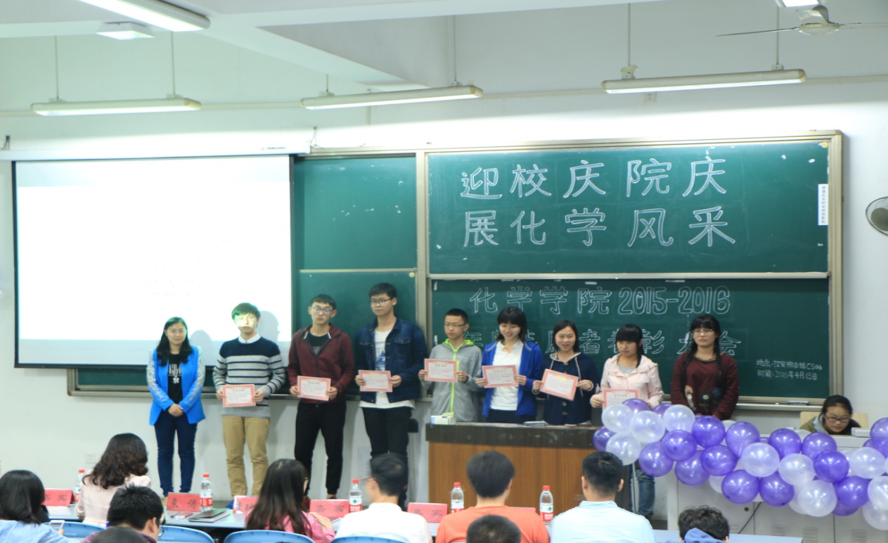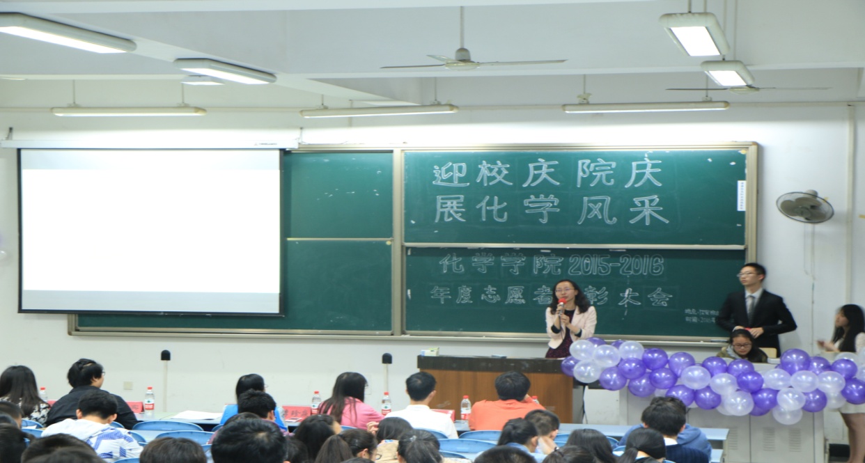 2016年4月15日19:30,由化学学院团委青年志愿者服务队主办的“迎校庆院庆,展化学风采”志愿者表彰大会在江安校区综合楼C座506教室正式举行。出席本次活动的嘉宾有团委书记来俏老师,2015级辅导员李珍焱老师,学生会主席周柏辛,副主席王振宇、焦健,团委副书记黄雅琳以及阳光青年志愿者服务队队长江淼洁,以及2015级所有的同学。