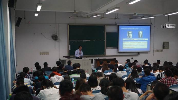 2015年10月11日南京大学化学化工学院谢代前教授在江安校区综合楼C座205教室,做了题为“水分子解离动力学理论研究”的学术报告。本次报告会由英国上市公司365化学学院14级辅导员张愉老师主持,化学学院14级全体同学参加了报告会。