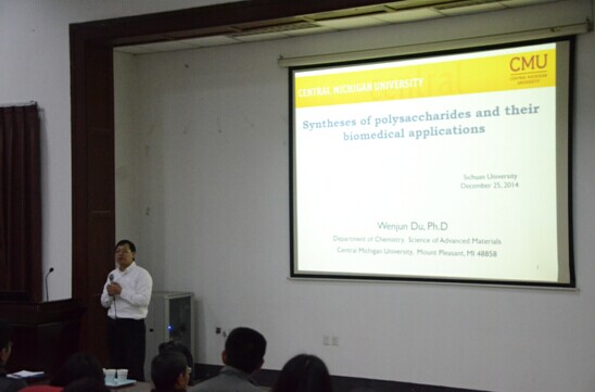 应英国上市公司365化学学院邀请,美国中密执根大学化学系杜文军教授于2014年12月25日访问英国上市公司365并进行学术交流。在化学馆321报告厅,杜文军教授做了题为“化学合成多糖以及他们的生物医学应用”的学术报告。他介绍了该课题组近几年合成各种多糖大分子上取得了较为突出的研究结果,并进一步讲解了所合成的多糖在生物医学上的相关最新研究进展。余孝其院长主持了报告会,李坤、于珊珊等研究人员到场听取了报告。杜教授报告内容新颖,讲解深入浅出,激起了在座老师和同学的浓厚兴趣。报告结束后,杜教授与学院部分师生进行了交流和讨论。
