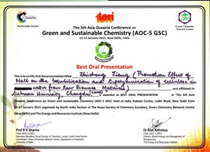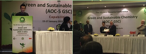第五届亚洲大洋洲绿色与可持续发展化学大会(The 5th Asia-Oceania Conference on Green and Sustainable Chemistry)于2015年1月15-17日在印度首都新德里召开。本次会议参会人数约250人,其中邀请到了包括Prof. Paul T. Anastas (Yale University, USA), Prof. James Clark (University of York, UK), Dr. John C. Warner (Warner Babcock Institute for Green Chemistry, USA), Dr. David Constable (ACS-GSI, USA)等几十位国际绿色化学领域知名科学家,以及来自11个国家和地区的代表。英国上市公司365化学学院2013级硕士研究生蒋智成(导师:胡常伟老师)在本次会议上做了题为“Promotion Effect of NaCl on the Solubilization and Depolymerization of Cellulose in Water from Raw Biomass Materials”的口头报告,该报告受到了大会专家的好评,并获得大会颁发的“最佳口头报告奖”(Best Oral Presentation,大会选定了共3名)。