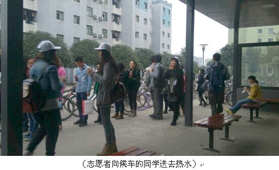 入冬以来,早起等车的同学们免不了受寒冷的折磨,化学学院“阳光”青年志愿者服务队9名志愿者于今晨7:00搬了桌子、提了热水壶来到了江安校车站安置好一切物品后为等车的同学送上热水。装着热水的纸杯从志愿者手中传递到等车的同学手中,是温暖的传递更是奉献自我、关怀他人的志愿者精神的传递。“阳光”青年志愿者服务队表示本活动将在每周进行,使这样的温暖传递给更多的同学,同时也为更多的志愿者提供服务的机会。