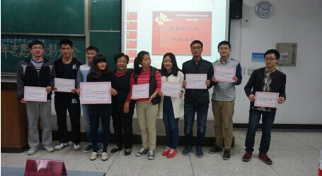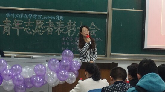 大会第二项,化学学院团委书记来俏老师做总结,对青志提出“新的高度,新的挑战,新的突破”要求,并宣布优秀志愿者和优秀班级小分队名单,35位同学和2013级101小分队得到表彰。在热烈的掌声中,郭明秀老师上台为获奖的志愿者们颁奖并合影,从郭老师关切的眼神里,我们看到了她对这届青年志愿者的赞赏和对新一届志愿者的期望。