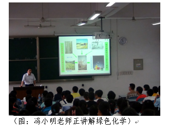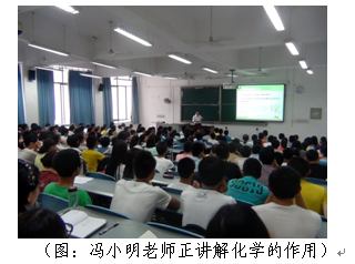 讲座伊始,谢均老师先为同学们简单的介绍了冯小明教授的背景情况,同学们都以热烈的掌声和认真聆听的姿态表达心中的敬佩。接着冯小明老师从李克强的讲话入手谈及化学的重要性。以化学家在做什么,这一问题展开讨论,分别从化学与实用、化学与生物、化学与健康(生命)、化学与计算机等方面讲解化学的今天。然后就环境污染、资源枯竭等现状谈及化学的明天,化学的未来。