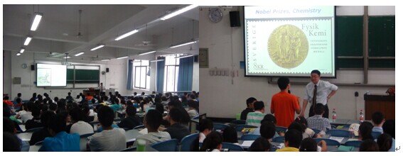 讲座伊始,游劲松老师先向同学们介绍Jack Li教授,李教授先从传统的酿酒讲起,指出酿酒过程中的有机反应,并以此带领大家走入有机的世界。学习一门学科,首先要了解这门学科的历史。所以李教授紧接着向同学们介绍了有机学科发展的一些重大的历史性事件,并以邮票为背景向同学们介绍有机化学方面的名人事例,主要讲到20世纪在有机化学方面的诺贝尔奖得主以及他们对有机化学所做的贡献。最后李教授以自己在有机方面所做的一些研究结束此次对同们有机化学的启蒙教育。