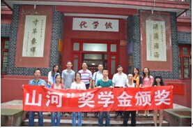 首先,余孝其院长致辞。为我们讲了“山河奖学金”设立的历史,及对杰出校友在自身成功的同时,不忘记回馈母校的感谢。接下来,汪瑜经理用自己的亲身经历告诉同学们,化学专业的前景是非常光明广阔的,且人只要活着就应该不断地学习,要热爱生活,那样你遇到的困难也不是那么困难了。之后,由王智猛书记宣布获奖学生名单。之后,到场嘉宾为获奖同学一一颁奖。