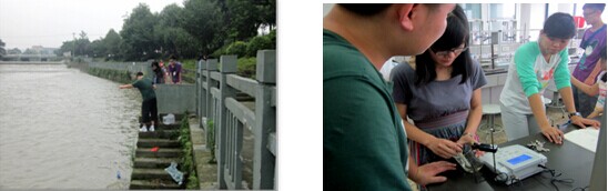 本年度国际交流营的同学被分为六个调查小组,分别对成都周边不同地点的水质,不同的水质指标如pH值、COD、硬度等进行了调查分析。选定调查项目后,各组同学开始积极查阅资料,热烈讨论,认真拟定实验方案,并在各位老师的引导下,不断地对实验方案、实验步骤进行修改完善,确保调查活动顺利进行。随后,各位同学随即投身到简易取水装置的制作、水样的采集、预处理和分析测试等各项工作中。,同时,在调查活动中,同学共同努力,遇到问题一起讨论解决,为留学生和我院同学相互交流提供了良好的契机。