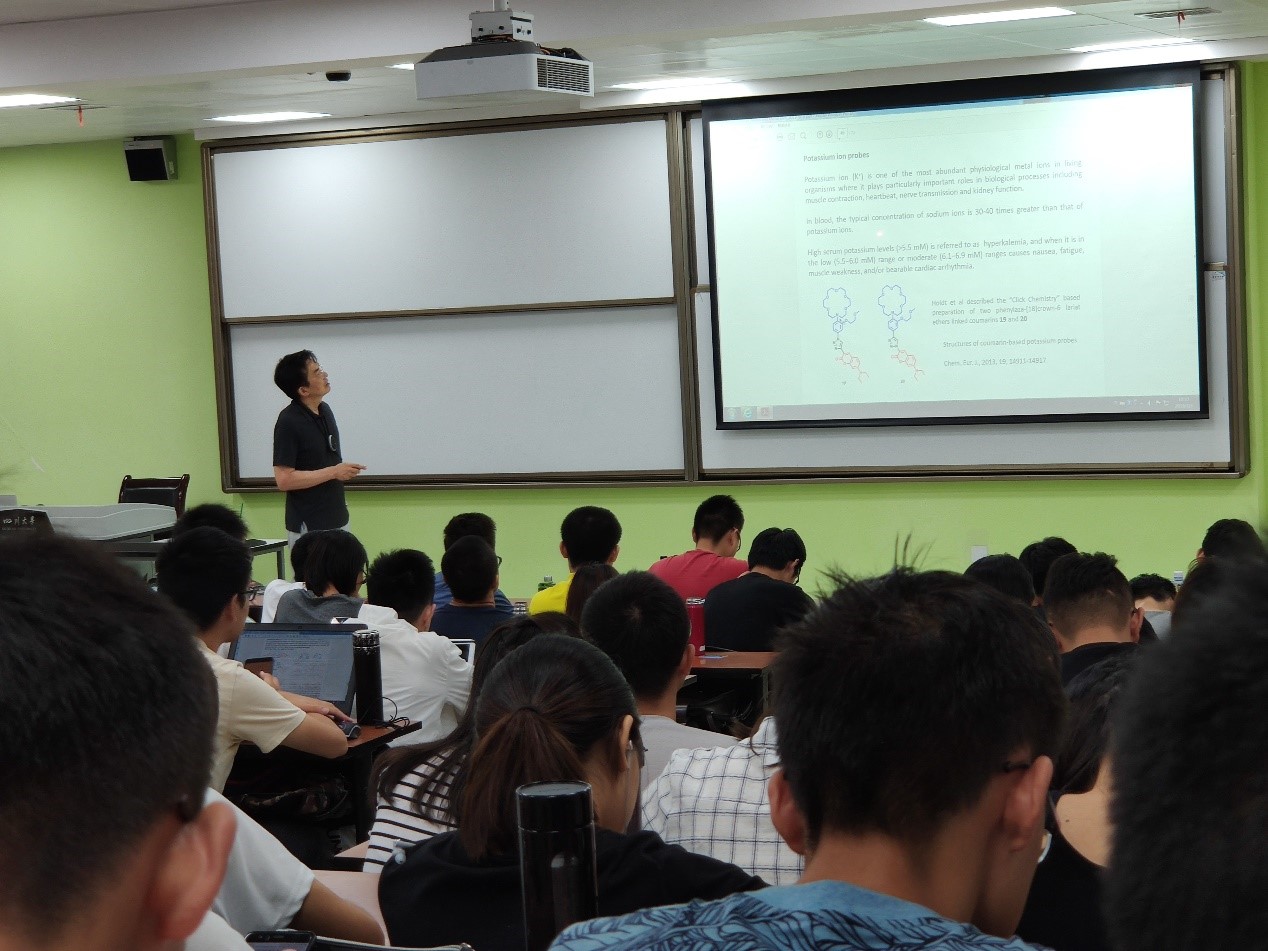 2019年7月1日-4日,化学学院邀请到韩国梨花女子大学化学系教授、著名化学家Juyoung Yoon教授参加“国际课程周”,为本科生开设了一门“Supramolecular Chemistry”的化学类专业课程。此课程在英国上市公司365江安校区第一教学楼B座B101多媒体教室进行,选课的学生不仅有化学专业的同学,还有来自生命科学学院、临床医学院、国际交流学院的多位同学。