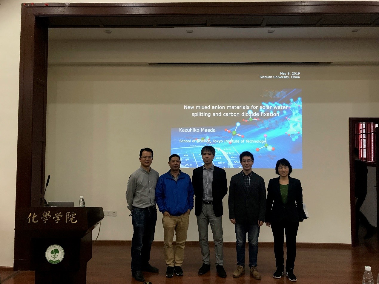 在报告中,Maeda教授重点介绍了利用非均相光催化剂将光能转化为化学能,以实现水分解和二氧化碳固定的研究。Maeda教授首先具体介绍了利用半导体光催化剂和金属络合物的复合物实现二氧化碳的还原的工作。其后,又详细介绍了可氧化水的一种新的无机光催化剂。整场报告内容丰富,Maeda教授讲解思路清晰,由浅入深,形象生动地向我们展示了他们课题组的工作,在座的师生全神贯注、兴趣盎然。在随后的自由提问环节,在座师生与Maeda教授进行了深入地讨论交流,大家都表示获益匪浅。报告在全场师生热烈的掌声中落下了帷幕,结束后部分老师与Maeda教授进行了合影留念。
