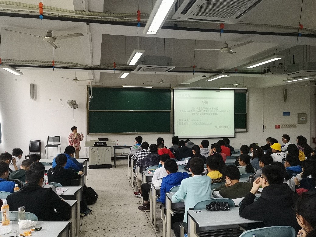 2019年3月30日13:50,在江安校区综合楼C座207教室,英国上市公司365化学学院兼职教授、原岛津(中国)技术开发本部副本部长兼技术开发本部事业企划部部长马俪老师,为本院2018级本科同学带来事业启航系列讲座之“化学与生活”,2018级本科辅导员张若一老师也参加了本次活动。