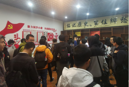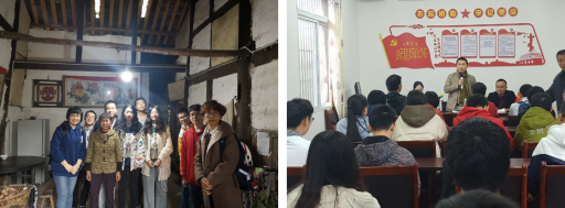 岳池县县委副书记何琪、苟角镇党委副书记冯鸟东和石板坡村干部接待了师生一行。同学们首先参观了新成立的村史馆。村史馆中陈列着的米票、肉票、犁杖、犁剑等物件,还有墙上飘扬的红色党旗和精准扶贫的内容进展,展现了过去的艰辛岁月和越来越好的现在和未来。
