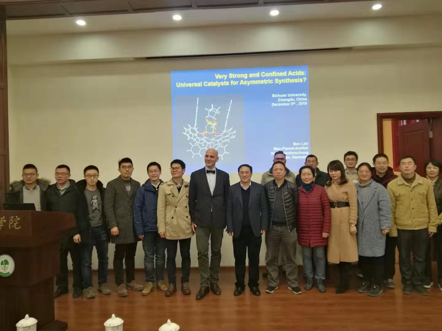 在此次报告中,List教授首先介绍了不对称催化领域所面临的机遇和挑战——仅有酶催化和有机金属络合物催化不对称反应。针对该领域的科学问题,他们首次运用L-脯氨酸作为有机小分子催化剂催化不对称aldol反应,开创了有机小分子催化的先河并引领了有机小分子催化剂的发展。随后,List教授进一步讲解了他们课题组基于手性联萘衍生的强酸催化剂通过抗衡离子导向不对称催化(ACDC)策略实现的一系列不对称反应。而后List教授介绍到虽然他们已经拥有强大的强酸催化剂系统并实现了一系列高效有用的不对称反应,但是在某些反应中还不能得到令人满意的结果。由此他们又设计合成了手性联萘衍生的限域的酸性更强的亚氨基双磷酰亚胺酸酯(IDPi)催化剂。通过运用IDPi强酸催化剂,他们解决了许多不对称催化领域长期难以解决的问题,例如实现了醛的不对称Hosomi-Sakurai烯丙基化反应;通过该催化剂的运用,他们也能将许多反应的催化剂用量降低到ppm甚至ppb级,极大的节约了成本。List教授讲解清晰,由浅入深,形象生动地向我们展示他们课题组发展的手性强酸催化剂在有机合成的应用以及在有用功能分子合成中的巨大潜能。在随后的自由提问环节,在座师生与List教授进行了深入地讨论交流,大家获益匪浅。报告在全场师生热烈的掌声中落下了帷幕,结束后部分老师与List教授进行了合影留念。