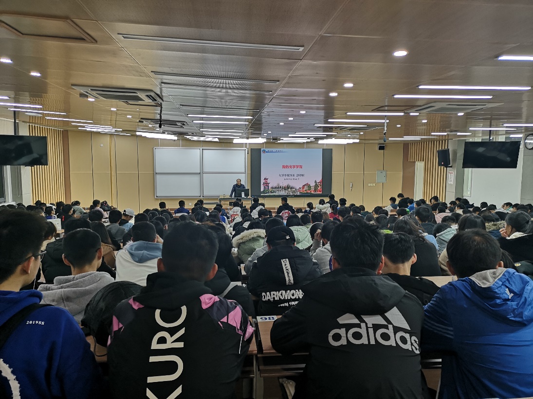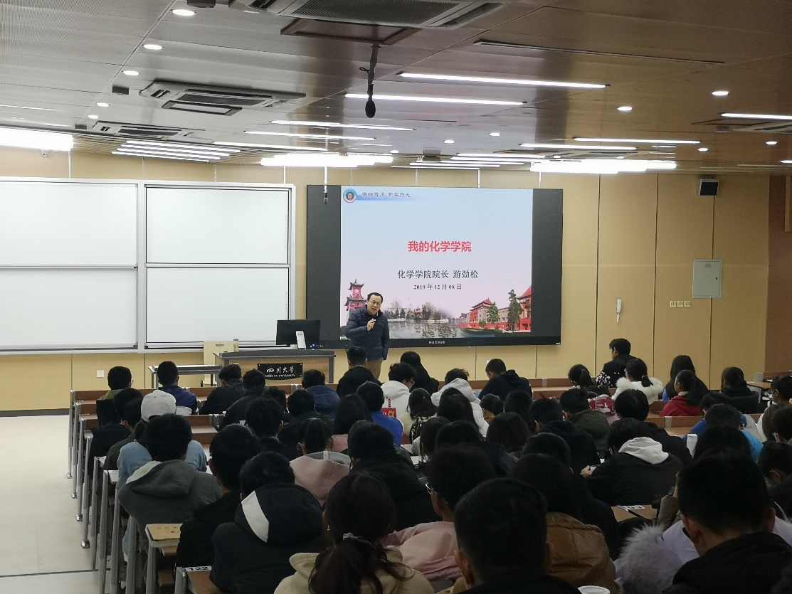 12月8日晚,化学学院院长游劲松教授以“我的化学学院”为题,在江安综合楼C座C307为学院2019级全体本科生讲授了一堂精彩的思想政治教育课。