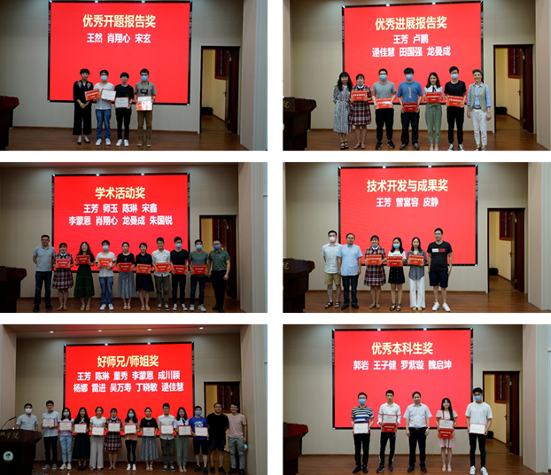接着吴刚老师宣读了实验室2020年度春季学期各项单项奖的获奖人员名单,奖项包括:“优秀开题报告奖”、“优秀进展报告奖”、“学术活动奖”、“技术开发与成果奖”、“好师兄/师姐奖”与“优秀本科生奖”,共计奖励33人次。实验室各位老师为获奖同学颁发了证书。
