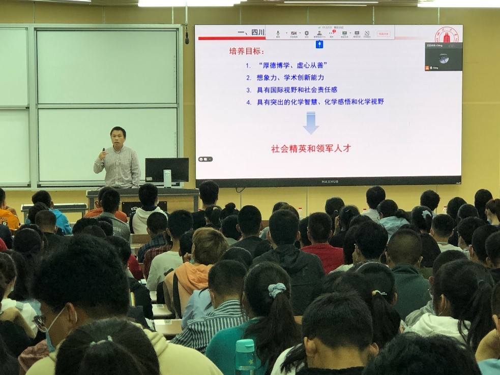 化学学院副院长郑成斌教授为同学们和家长们介绍了化学(强基计划)、拔尖人才计划、化学(基地班)的选拔、培养机制,并简述了化学学院本科课程体系与本科培养基本情况,为同学们的大学学习生活以及未来规划提供了宝贵的意见。