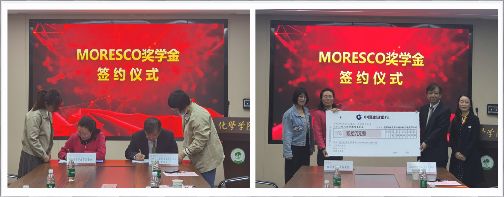 接着,刘英进先生和杨帆女士分别表达了对化学学院学子的期许,勉励获奖同学要以兴趣来驱动学习和科研,以后用所学知识回报国家、社会和家人。随后,刘英进先生和贾秀娥老师续签了为期四年的MORESCO奖学金捐赠协议,贾秀娥老师为刘英进先生颁发了捐赠证书。