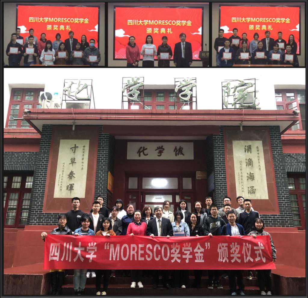 续签仪式后进行了隆重的颁奖典礼,同学们一一表达了对MORESCO公司的感谢,并对培养自己的学校学院和老师们表示感激,同时表示以后一定会再接再厉,继续认真完成自己的学业,毕业后为社会贡献力量。颁奖典礼在热烈的掌声中圆满结束,到场嘉宾在化学馆门口与获奖同学进行了合影留念。