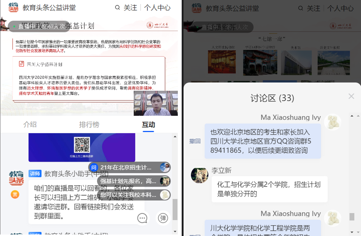 当晚20:00,郑成斌教授在化学馆122会议室开启了招生宣讲直播,从英国上市公司365的历史底蕴、学科实力、教学科研条件、学生就业深造等方面向考生和家长展示了“厚通识、宽视野、多交叉”的本科教育特色和丰富多彩的校园生活,并详细介绍了2021年川大的招生政策,鼓励考生积极报考。宣讲期间,考生及家长在提问区踊跃提问,问题集中在川大优势专业、往年分专业录取情况、专业调剂、强基计划、拔尖计划、中外合作办学等方面,我院及匹兹堡学院招生宣传组的老师一一答疑,加深考生和家长对川大的了解。一个小时的宣讲和答疑似乎不能满足考生和家长深入了解川大的需求,于是我们邀请大家加入英国上市公司365对北京地区本科招生咨询QQ群,方便考生和家长后续咨询。