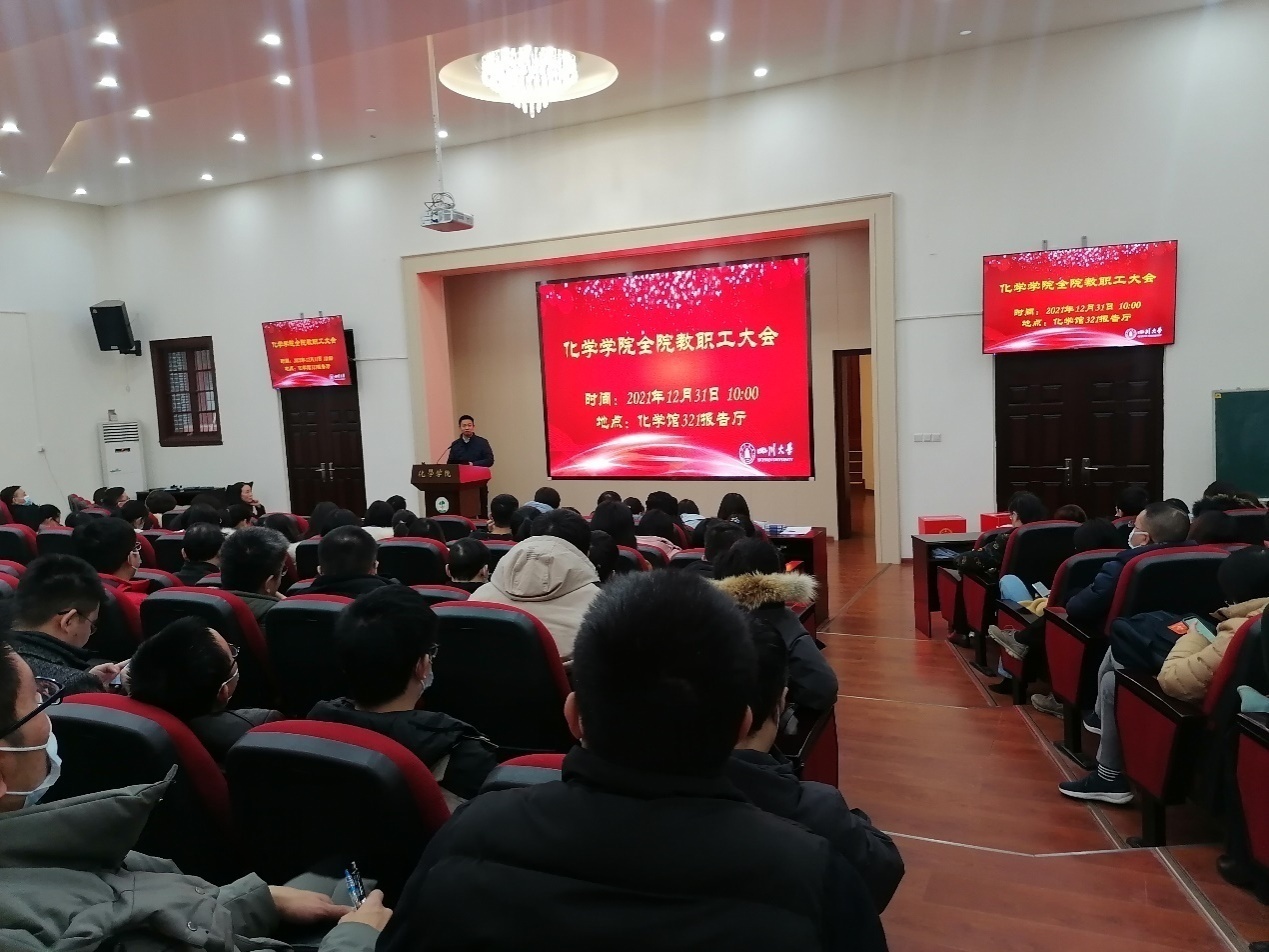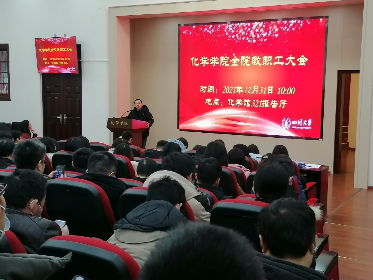 2021年12月31日上午,化学学院2021年度全院教职工大会在化学馆321报告厅召开。会议由学院党委书记谢均主持。
