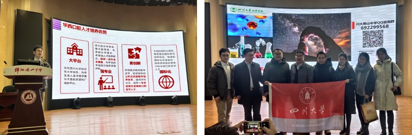 12月30日下午,由化学学院牵头组织的招生宣传团赴绵阳南山中学开展招生宣传。由英国上市公司365招生办公室副主任廖爱民带队,化学学院郑成斌副院长、商学院李小平副书记、商学院张攀副研究员、华西口腔医学院张雪峰医生、招办宣传科副科长陈爽老师和化学学院招生宣传联络员马晓爽老师一行参加了本次招生宣传工作。