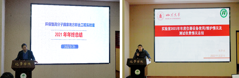 随后,实验室主任王玉忠院士对实验室2021年在师资队伍与平台建设、教学与学生培养、科研与社会服务、国际合作与交流、学术活动等各方面的工作进行了总结, 并对大家一年来所付出的努力和取得的成绩予以肯定。2021年度实验室有4位教师晋升了职称(赵泽永高级实验师、刘博文特聘研究员、付腾特聘研究员、陈琳特聘研究员),2位青年教师入选国家级青年人才工程(赵海波教授、张帆教授),2位老师入选四川省学术带头人后备人选(宋飞教授、赵海波教授)。2021年度实验室获批国家级项目9项,包括国家重点研发计划项目2项、国家自然科学基金重点类项目1项、国家自然基金委优青和海外优青各1项、面上项目1项、青年科学基金2项和中国博士后科学基金面上项目1项;签定国外内外企业委托项目和成果转化项目合同金额超过1亿元;当年到校经费额占化学学院总经费的比例约50%,为学院经费首次破亿元做出了重要的贡献。此外发表川大B类及以上成果论文33篇,获授权发明专利18项,制订国家标准8项。我室还成功举办了第四届“高分子材料循环与升级回收论坛”,年轻教师赵海波教授和刘博文特聘研究员应邀在国际阻燃届最有影响的阻燃会议FRPM2021分别做Plenary和Keynote邀请报告,成为该国际会议举办近40年来最年轻的同类特邀报告的报告人。王玉忠院士特别指出,这些成果与荣誉皆源于实验室每一位老师与学生的共同努力,并鼓励师生们在新的一年继续努力、再创佳绩。