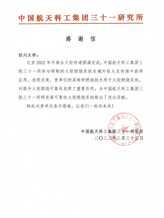 据悉,刚刚结束2022北京冬奥火炬境外取火和火炬传递取得圆满成功。航天科工集团三十一研究所是火炬系统研制和生产单位之一,我院王健礼教授团队研制的催化燃烧技术成功应用于火炬燃烧系统,对提升火炬燃烧的可靠性发挥了重要作用。中国航天科工集团三十一研究所发来感谢信,感谢化学学院做出的贡献。