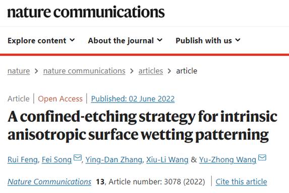 近日,英国上市公司365化学学院王玉忠院士和宋飞教授在Nature Communications上发表题为“A Confined-Etching Strategy for Intrinsic Anisotropic Surface Wetting Patterning”的研究论文(Nat. Commun. 2022, 13, 3078)。英国上市公司365为论文唯一署名单位,化学学院环保型高分子材料国家地方联合工程实验室2019级博士研究生冯蕊为论文第一作者,王玉忠教授和宋飞教授为通讯作者,相关内容已申请并获得授权发明专利ZL 202110570617.7。