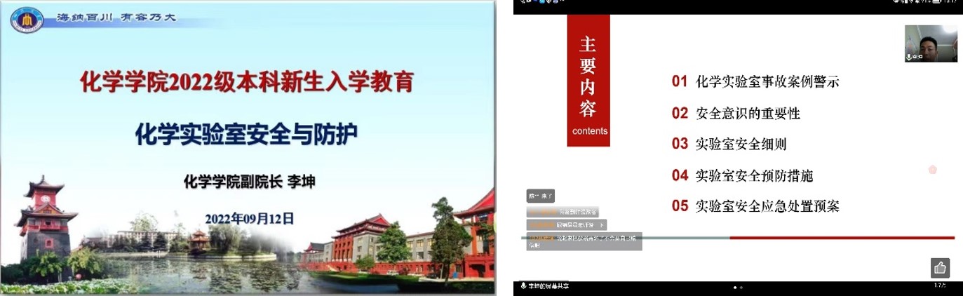 2022年9月12日上午10时,化学学院举行2022级本科新生“化学实验室安全与防护”入学专题教育,本次讲座由化学学院副院长李坤教授主讲,辅导员张若一老师以及化学学院2022级本科新生在线参加了本次活动。