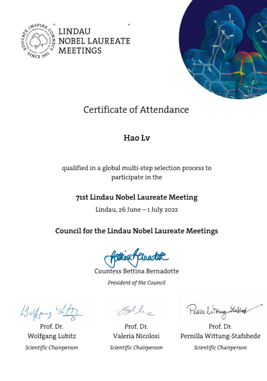 第71届诺贝尔奖获得者大会于2022年6月在德国林岛举办,本届会议主题是化学,尤其聚焦在催化与合成和有机催化方面。我院2020级博士研究生吕浩通过层层选拔,从全国众多知名高校的158名优秀博士生和青年学者候选人中脱颖而出,作为国内最终获得参会资格的30名博士生之一,与30位诺奖得主和来自90个不同国家地区近500位优秀的青年学者们共赴学术盛宴,探讨化学领域科研最新进展。