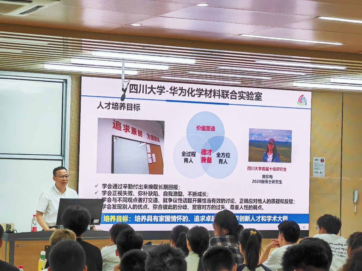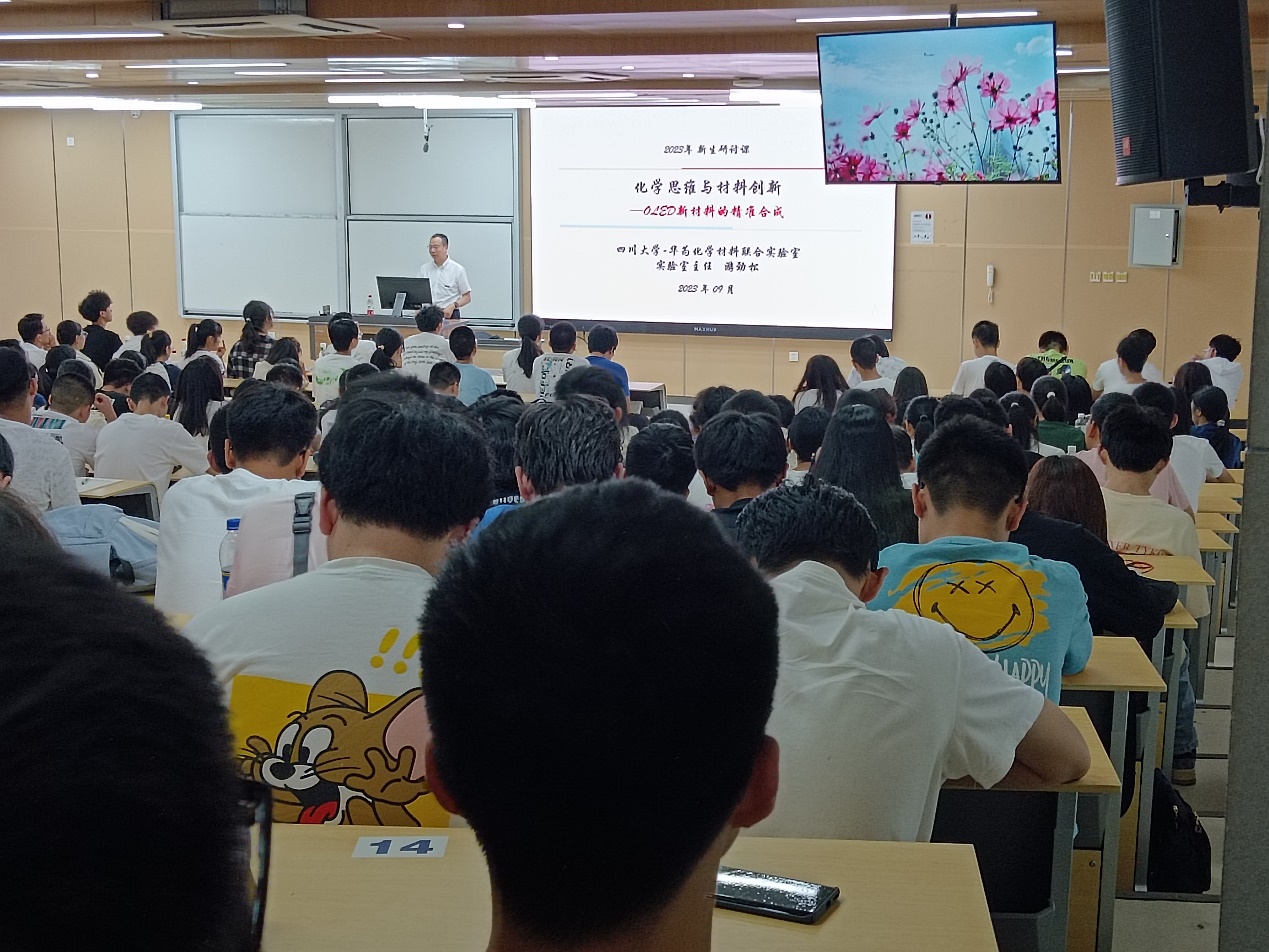 2023年9月13日下午,江安校区综合楼C207,化学与绿色化工科(群)首席科学家游劲松教授为化学学院2023级学生带来了“化学思维与材料创新”专业创新思维讲座。本次讲座由化学学院党委副书记肖波主持, 2023级辅导员浩涛涛及2023级全体学生参加了本次讲座。