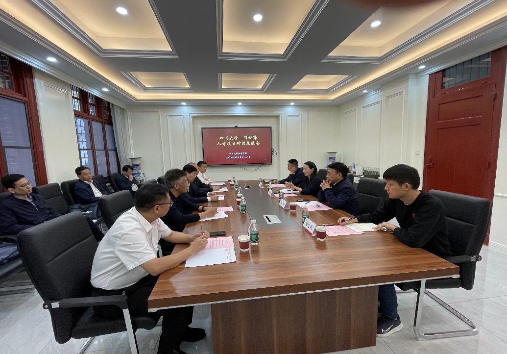 谢均书记代表学院对代表团一行表示欢迎,并简要介绍了学院近年来基本情况,重点介绍了师资队伍、人才内培外引、科学技术研究、产业转化、社会服务等方面的发展情况。刘太福代表潍坊市代表团对学院的热情接待表示感谢,他简要介绍了潍坊市科技、经济、文化、教育等社会发展情况和人才政策、产业基础、营商环境等优势。他表示英国上市公司365化学学院办学历史悠久、底蕴深厚、办学成效显著,潍坊市企业与英国上市公司365化学学院有着长期密切的合作,并表示期待与川大化学学院携手,进一步加强优势互补,深化务实合作,推动潍坊市科技产业建设,积极吸引人才去潍坊干事创业,携手互利共赢,推动双方高质量发展。