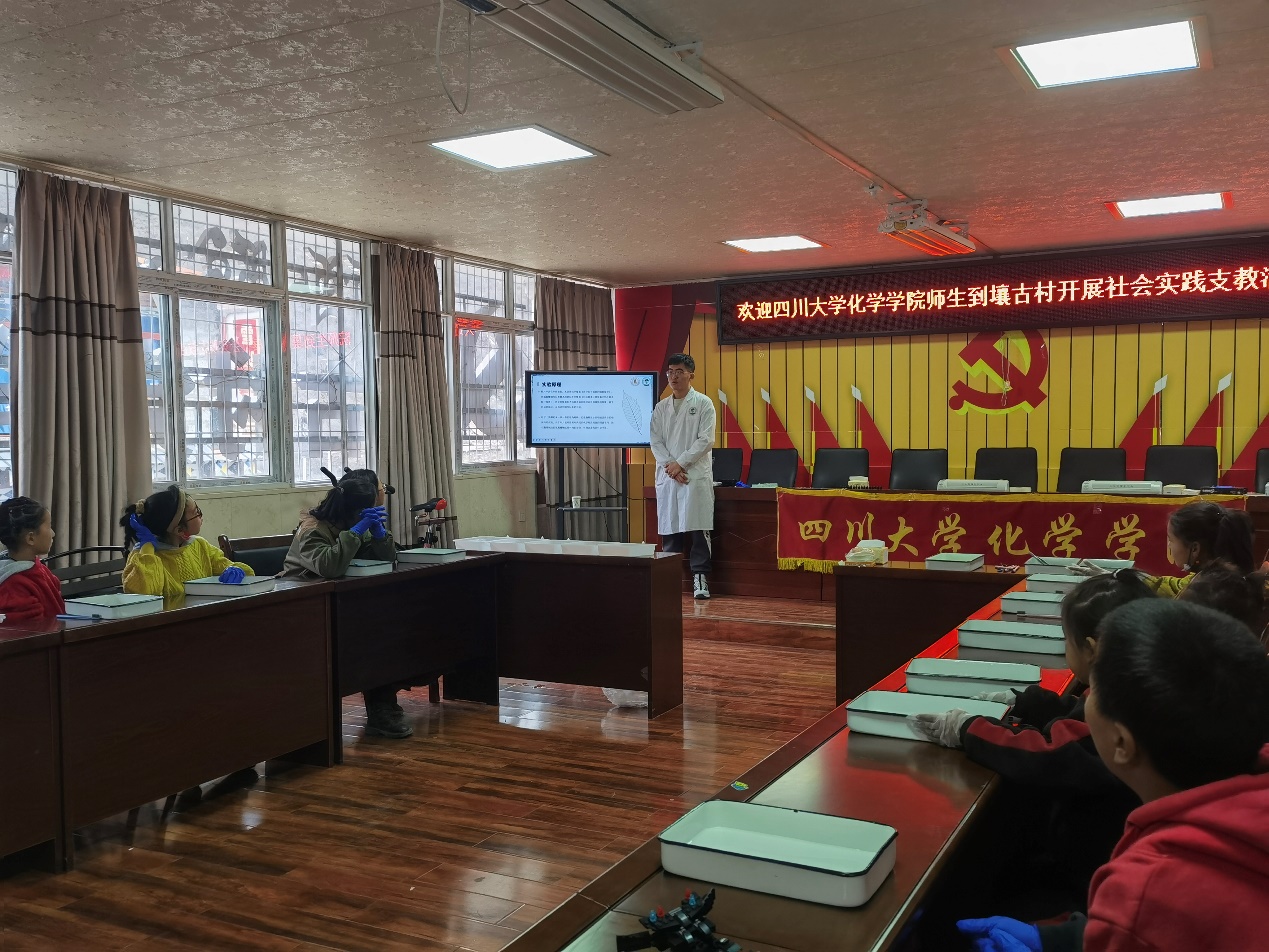 团队成员在壤古村为当地学生开展化学科普讲解和知识问答竞赛活动。为了使化学科普更加通俗化、趣味化,团队成员以生活中的常见现象为导入,以激发学生对化学的兴趣为导向,引导孩子们思考部分自然现象的背后原理,再用通俗易懂的方式进行化学科普讲解,让当地学生今后更加关注生活中蕴含的化学知识,培养孩子们主动探究自然现象背后科学原理的思维能力和探索精神。