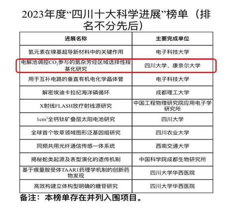 2023年度四川科技创新领域十大榜单重磅发布。榜单包括四川十大技术创新成果、四川十大科学进展以及四川十大科技创新领域年度人物三类。我院余达刚教授团队与康奈尔大学共同完成的“电解池调控CO2参与的氮杂芳烃区域选择性羧基化研究”成果入选四川十大科学进展榜单。