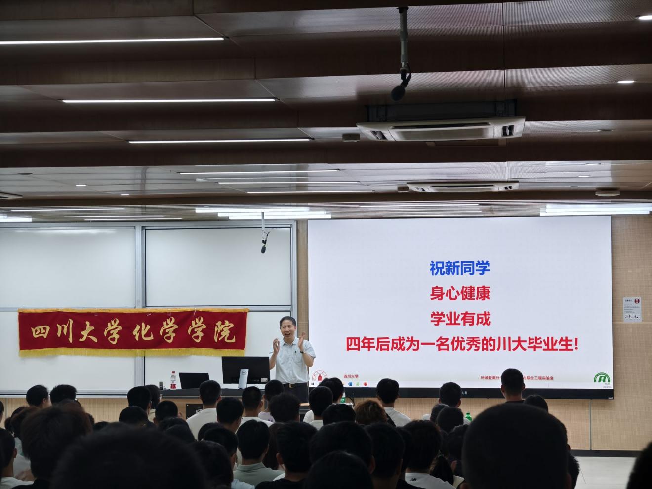 2024年9月8日,在江安校区综合楼C207,王玉忠院士为化学学院2024级本科生带来了新生入学教育讲座——勤奋加拼搏,让优秀成为习惯。学院党委副书记肖波、2024级本科生辅导员侯鹏飞及2024级全体本科生参加了此次讲座。