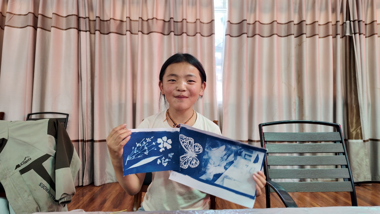 蓝晒,是一种古老的染色技术,利用铁盐与光的化学反应,在阳光照射中产生蓝色影像。团队带领壤古村的孩子们涂刷蓝晒液、裁剪设计图案、融合当地植物制作独特的化学工艺品。值得一提的是,团队准备了一张去年暑假科普活动所拍摄的照片——“大眼睛”小姑娘忠尕聚精会神注视着“水中花园”实验,而这次忠尕也亲自将这张有意义的照片晒了出来。“我会好好留着做纪念的”,她捧着那张珍贵的礼物满足又激动地告诉实践团队的老师同学们。