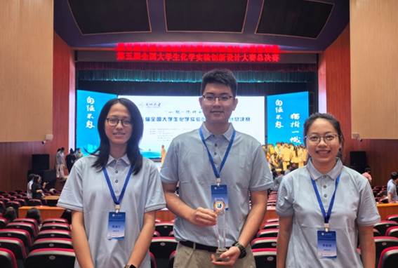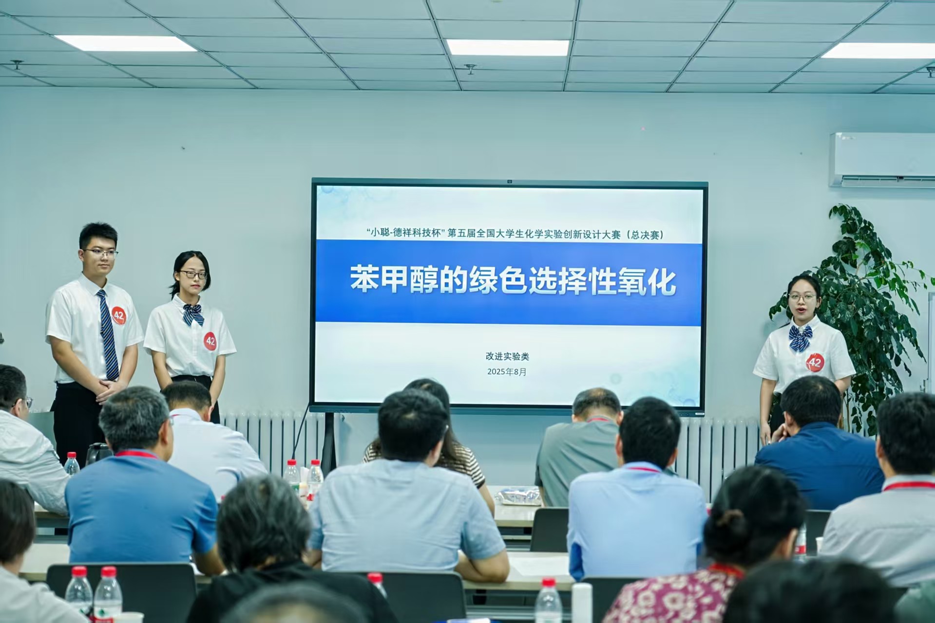 2025年8月21日-24日,“小聪-德祥科技杯”第五届全国大学生化学实验创新设计大赛总决赛在兰州大学城关校区成功举办。化学学院2022级本科生孙弈文、李佳佳、蒋涵宇三位同学的改进实验作品“苯甲醇的绿色选择性氧化”以西南赛区一等奖的优秀成绩冲入总决赛,经过激烈的角逐,从1000余支参赛队伍中脱颖而出,斩获全国总决赛特等奖。本次参赛作品的指导教师为化学实验中心任小雨博士、化学学院王天利教授。